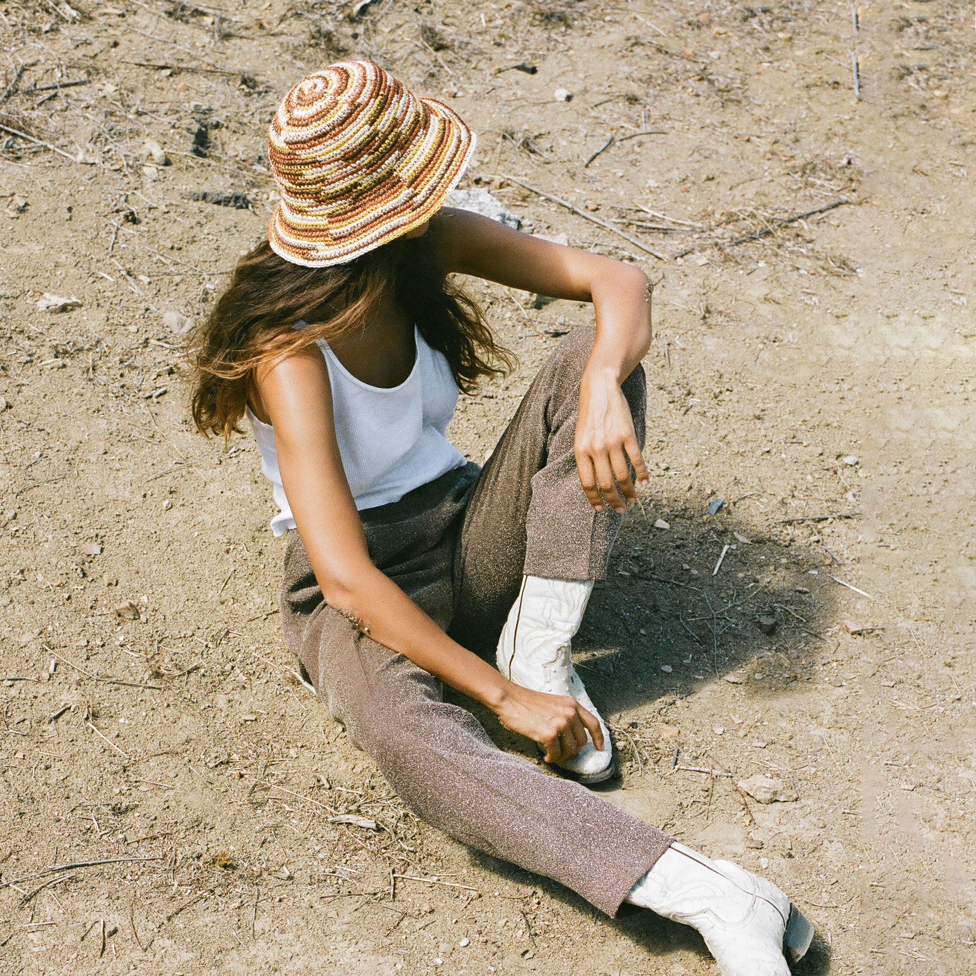 The beautiful tones on our woven bucket hats are made from plants. Our artisan partners collect organic matter like tree barks, leaves and berries to botanically dye and process the fiber.