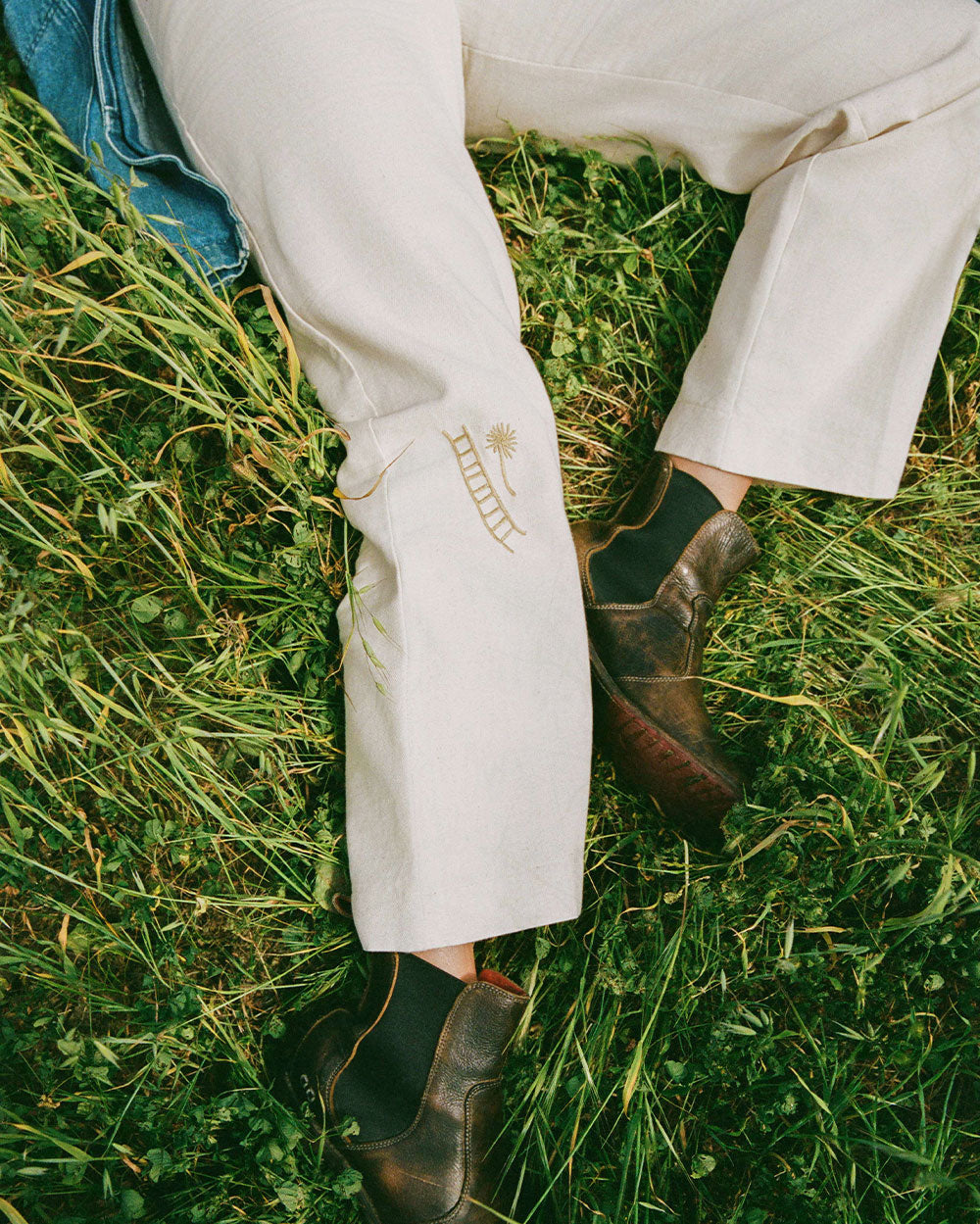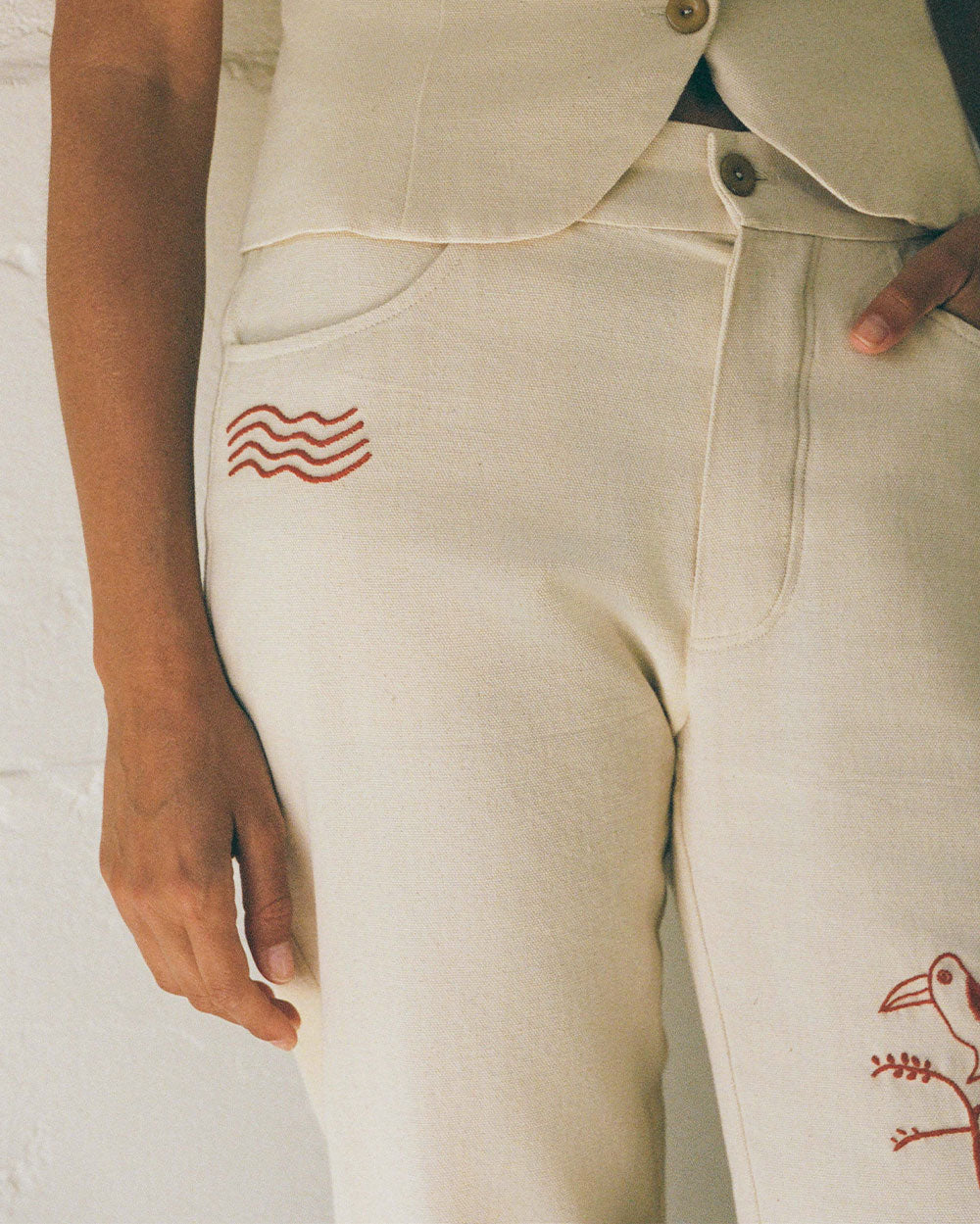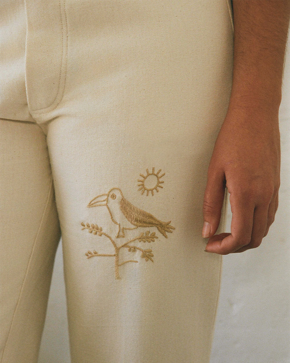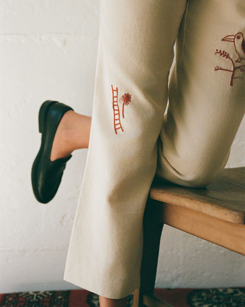 We’ve transformed these original works into hand-stitched embroidery—carrying their vision from canvas to cloth, now woven into every piece in this one-of-a-kind cotton line of matching sets and versatile, handmade wears.