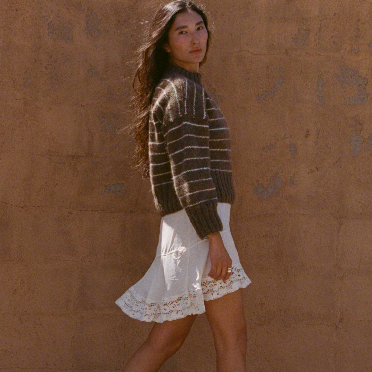 The Natalie Striped Sweater brings an understated charm to your everyday wardrobe. Hand knit from a baby alpaca blend, it’s luxuriously soft, lightweight, and designed to move with you through the seasons.